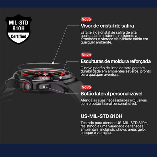 Durabilidade Extrema (Certificação Militar): Construído para resistir, ele possui certificação MIL-STD-810H, um bisel em titânio e tela com vidro de safira, tornando-o ultra-resistente a choques, vibrações, temperaturas extremas e quedas. A resistência à água 5ATM permite natação em águas rasas.