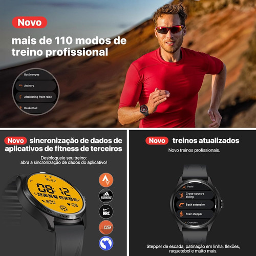 Monitoramento Avançado de Saúde: Acompanhe sua frequência cardíaca (com detecção de batimentos irregulares IHB/AFib), nível de oxigênio no sangue (SpO2), estresse, qualidade do sono (incluindo respiração), e até a temperatura da pele. Obtenha insights valiosos sobre sua saúde e bem-estar.