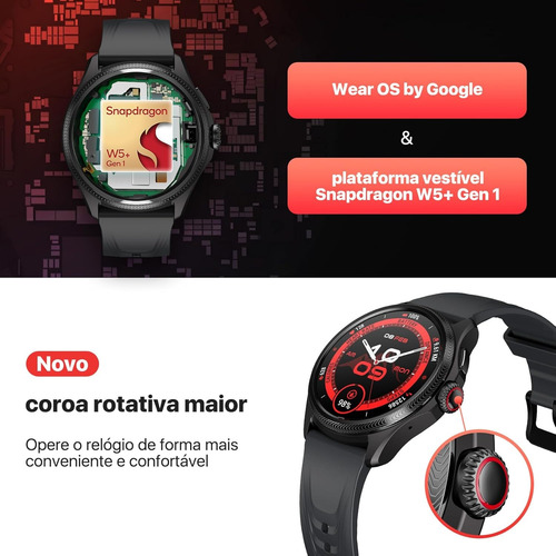 Processador de Última Geração: Equipado com a Plataforma Snapdragon W5+ Gen 1 Wearable, o TicWatch Pro 5 Enduro oferece um desempenho ultrarrápido e eficiente, garantindo fluidez em todas as suas tarefas.