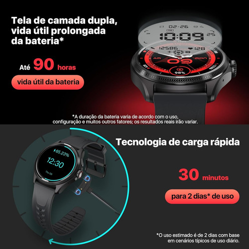 Bateria de Longa Duração: Com uma bateria de 628mAh, o TicWatch Pro 5 Enduro oferece uma autonomia impressionante de até 80 horas no modo inteligente, e ainda mais no modo essencial, garantindo que você fique conectado por dias. E com o carregamento rápido, retorne à ação em tempo recorde!