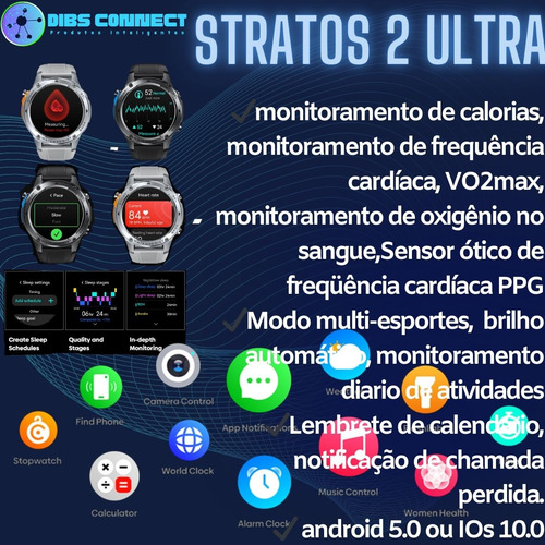 O Stratos 2 Ultra permite que você faça chamadas via Bluetooth, receba notificações de mensagens e aplicativos, e controle músicas e câmera do smartphone diretamente do seu pulso. Com suporte para assistente de voz e modos personalizados, como economia de energia e modo “não perturbe”, ele é ideal para um estilo de vida conectado e prático.