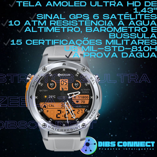 Ideal para quem busca um smartwatch completo, robusto e funcional! O Zeblaze Stratos 2 Ultra combina um design resistente com tecnologias avançadas para monitoramento de saúde, esportes e conectividade, tudo em uma tela AMOLED Ultra HD de 1.43”. Conta com certificação militar, resistência à água de 10 ATM e suporte para mais de 170 modos esportivos. Com suporte para chamadas via Bluetooth, altímetro barométrico e rastreamento preciso de localização, é perfeito tanto para aventuras ao ar livre quanto para o uso diário. Veja mais detalhes abaixo e descubra todas as funcionalidades que este smartwatch oferece!