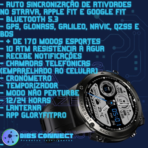 Timing: Relógio mundial, hora/data, GPS Time Sync, Horário de verão automático, cronômetro, temporizador, despertador.